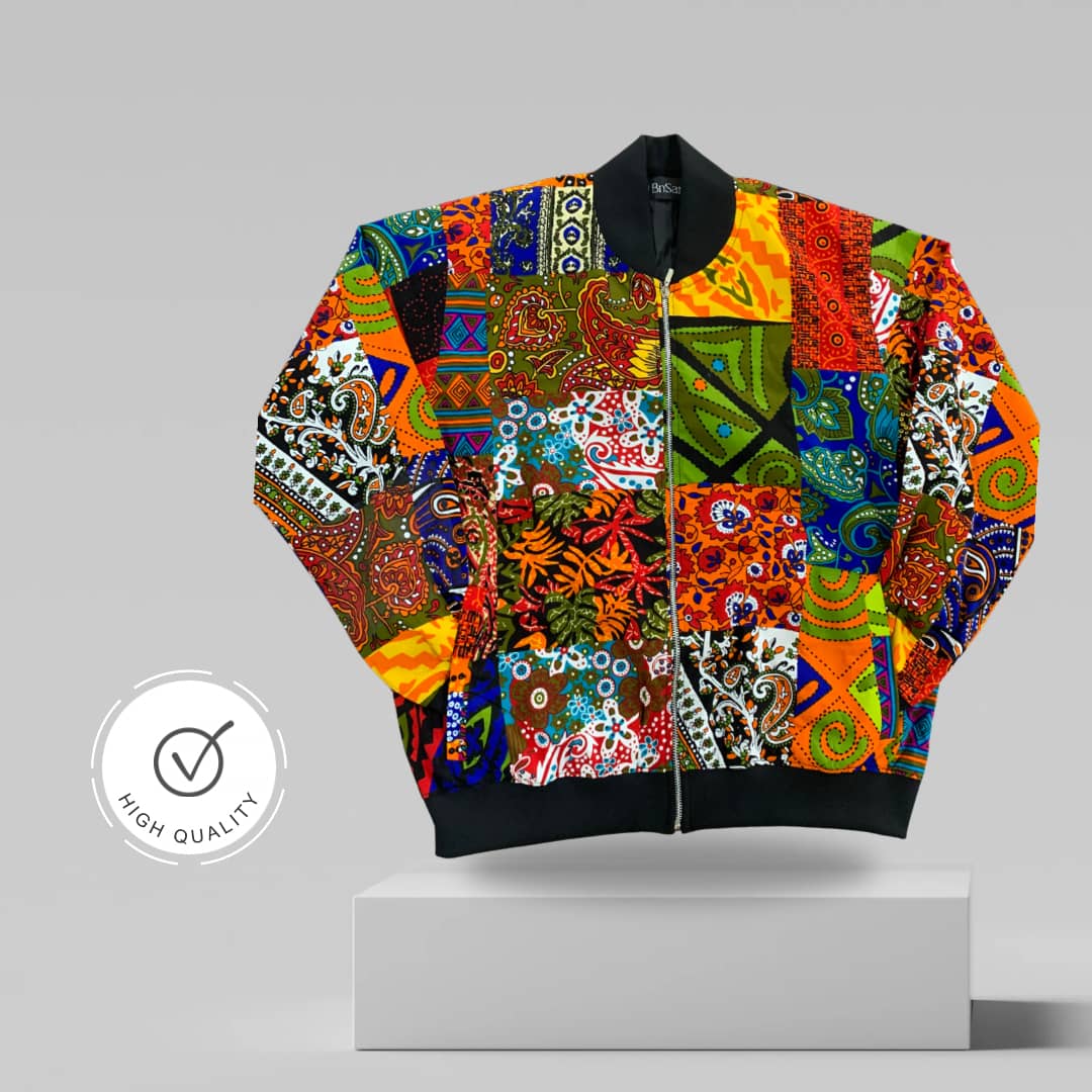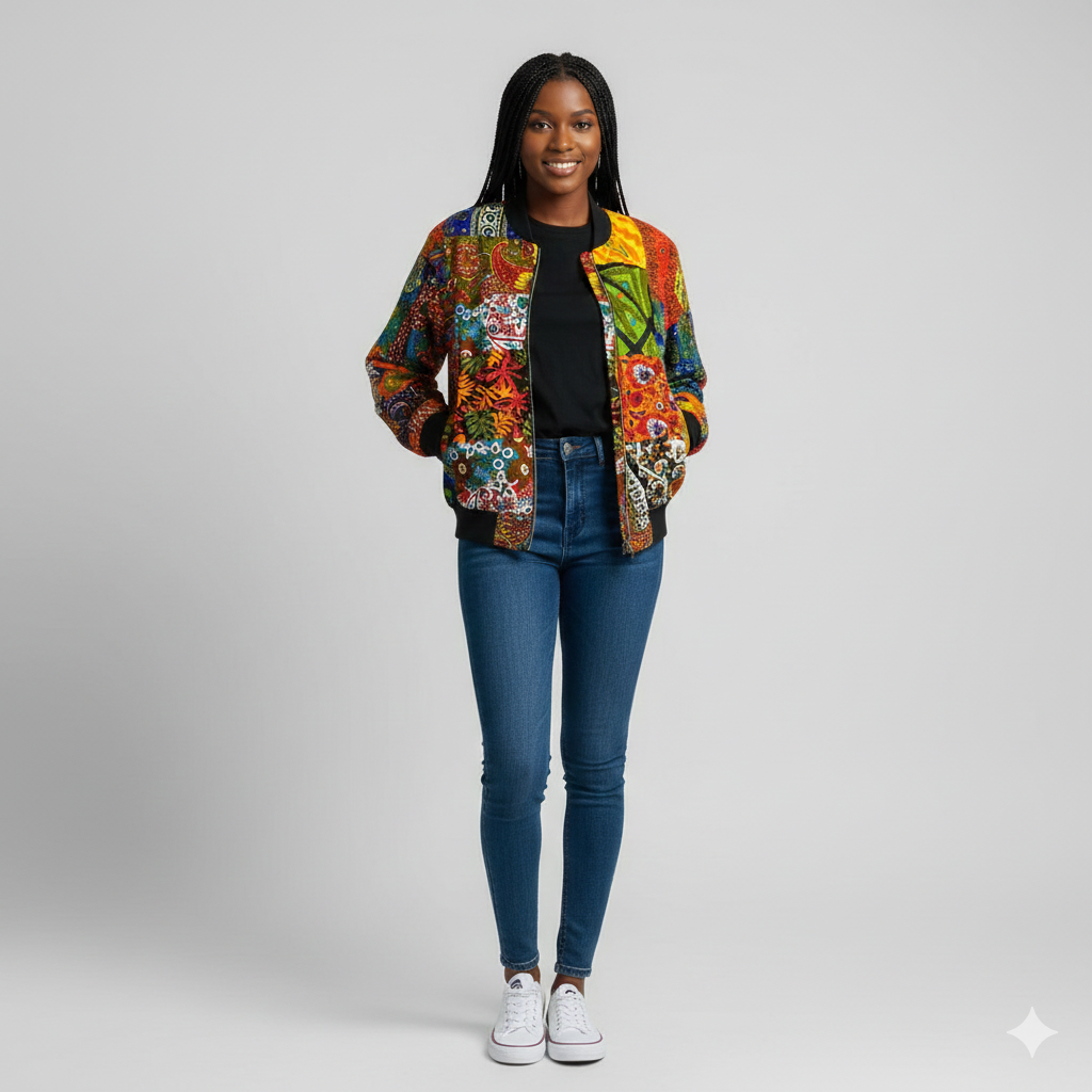 This multicoloured bomber jacket features a mix of eye-catching hues arranged in a stylish, modern pattern. Designed with a classic zip-up front, ribbed cuffs, and a fitted hem, it offers both comfort and a flattering silhouette. Ideal for layering over T-shirts or hoodies, this jacket brings a playful yet edgy touch to everyday outfits, making it a versatile piece for casual, urban, and fashion-forward looks.